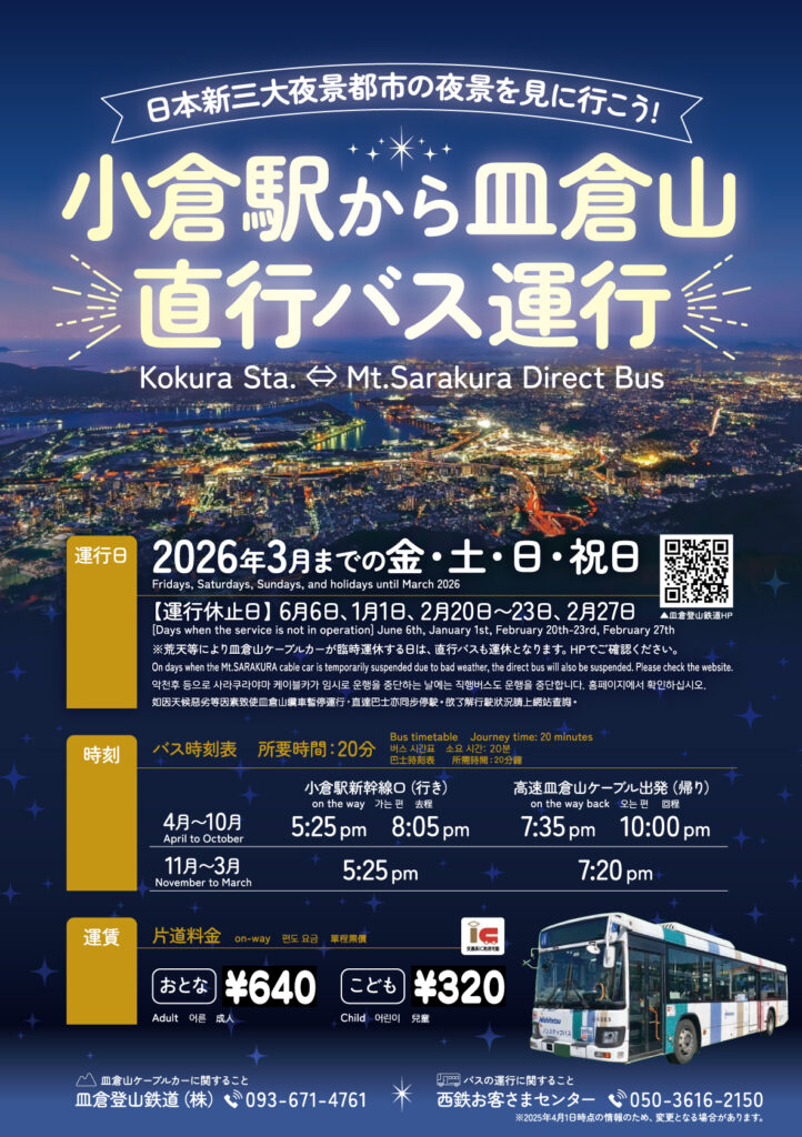 ※ There will be no operation of the direct bus from JR Kokura Station to Mount Sarakura on the following dates:2025.6.6、2026.1.1、2026.2.20~2.23、2.27