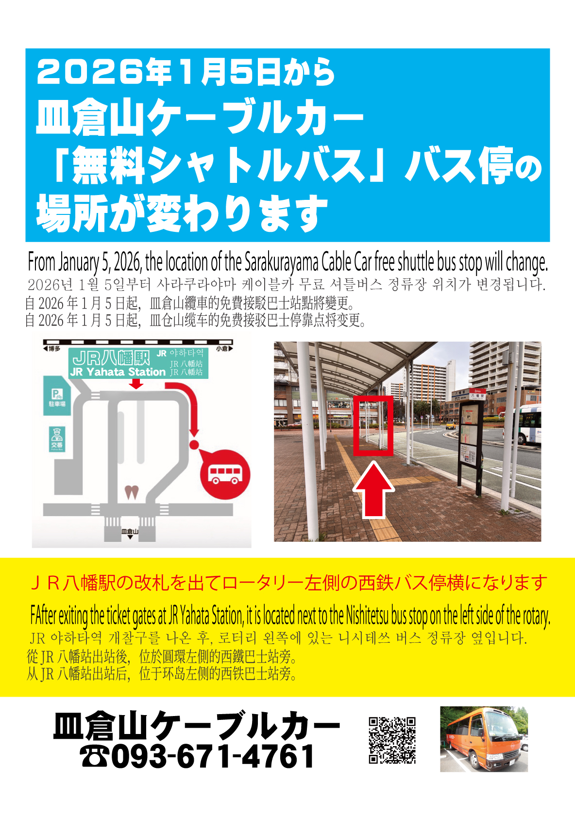 2026年1月5日(月)から、皿倉山ケーブルカー「無料シャトルバス」バス停の場所が変わります。